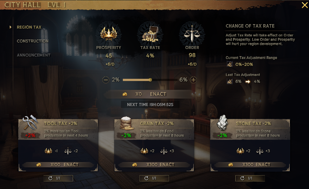 Picture the City Hall as your personal war room for all things governance. It’s a comprehensive dashboard allowing you to adjust tax policies, launch building projects, and even make important Ruler’s announcements to your residents and allies.
