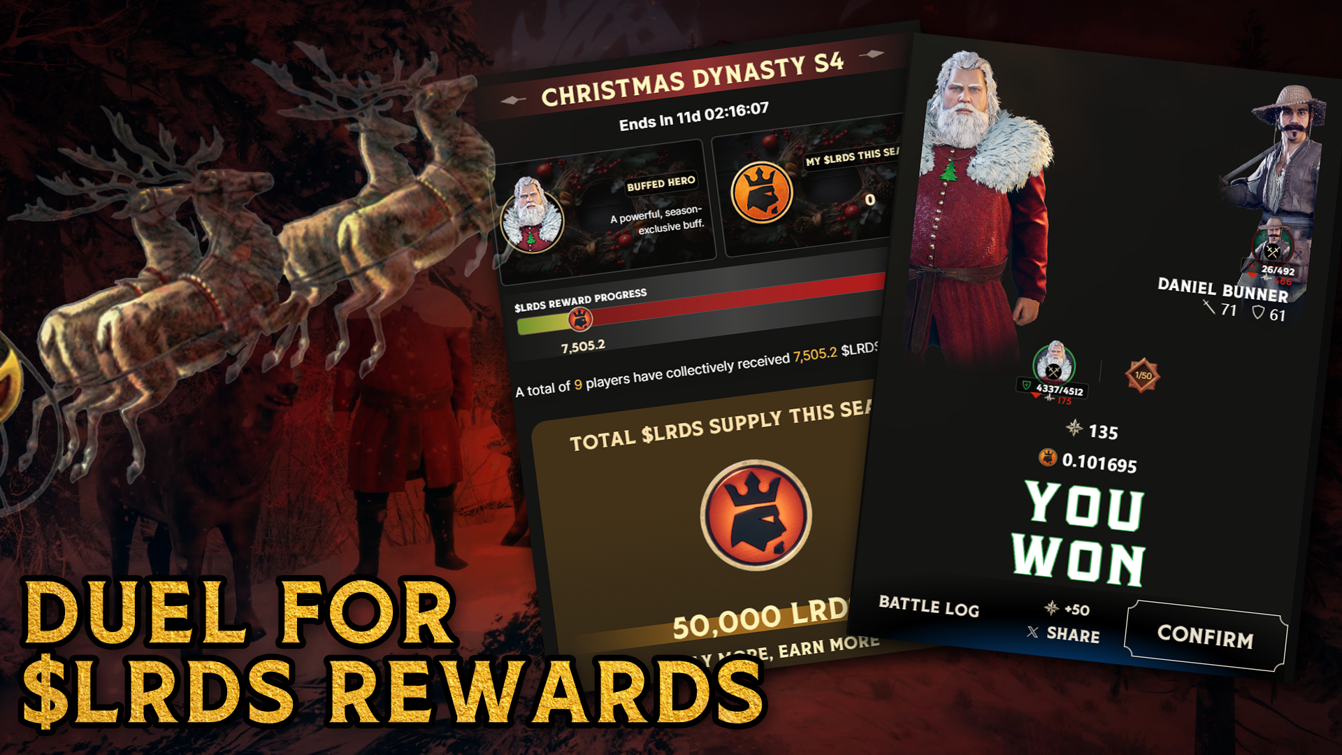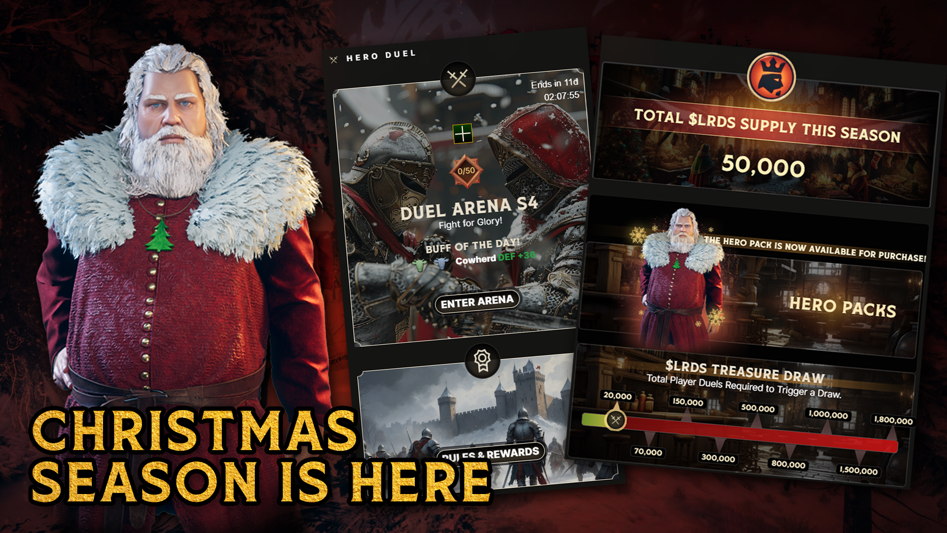 During this special season, $LRDS rewards from the original Duel Season will now be available throughout the entire Dynasty season, opening up new ways for players to earn and utilize $LRDS. Alongside this, unique mechanics such as $LRDS airdrops and exclusive Christmas Heroes with time-limited buffs will contribute to making this season an unforgettable one.<br>