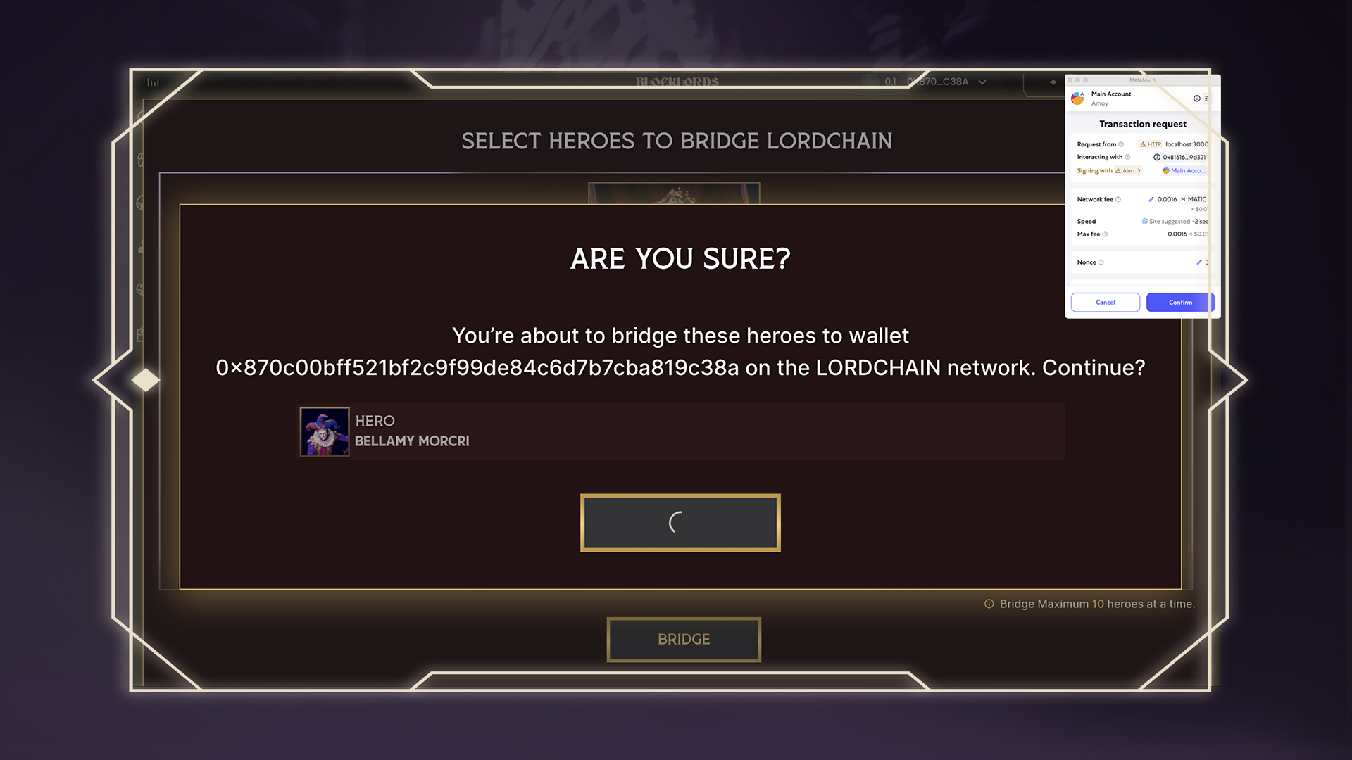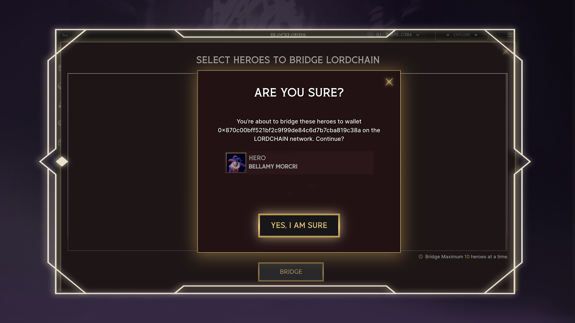 A confirmation window will display the LORDCHAIN wallet address where your hero will be sent.\