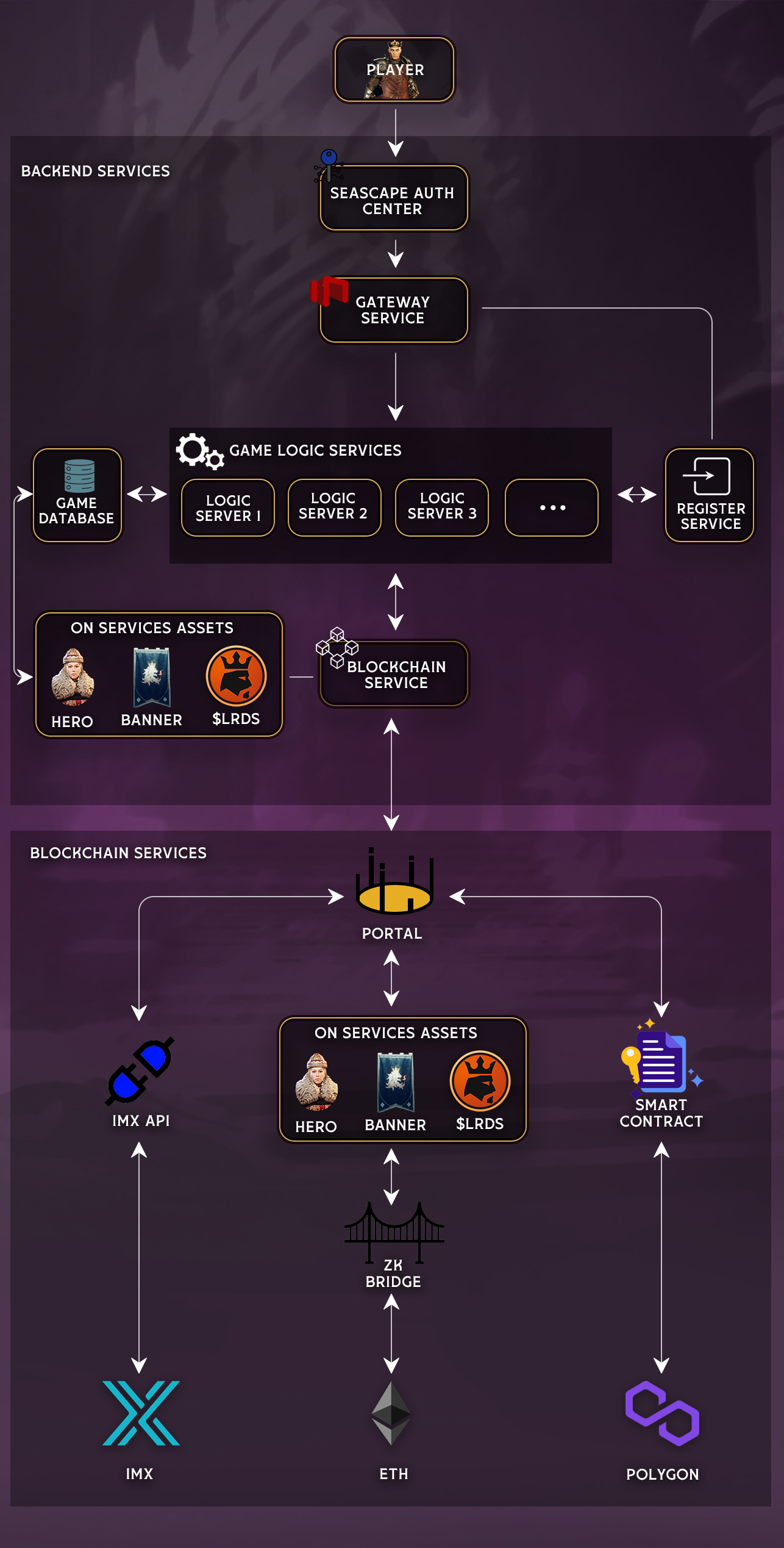 * **Inter-Blockchain Connectivity**: The [PORTAL](https://wiki.blocklords.com/technology/blocklords-portal) feature serves as a bridge between different blockchains and BLOCKLORDS' proprietary chain, LORDCHAIN. This technology enables players to seamlessly transfer their assets across different blockchain environments directly through the game client.